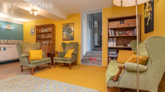 - Une pièce de vie avec TV, fauteuils, une bibliothèque et jeux de société