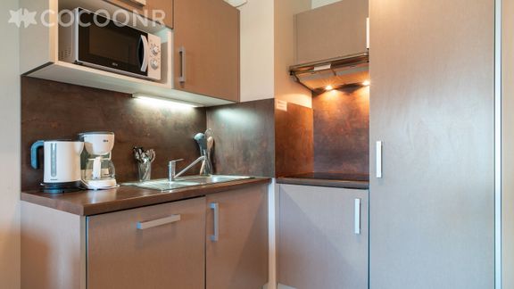 - Une cuisine équipée avec notamment : bouilloire électrique, four à micro-ondes, grille-pain, lave-vaisselle, plaques de cuisson...