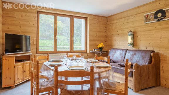 - Une pièce de vie de 18 m² avec canapé, TV et coin repas