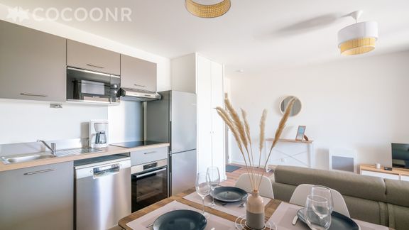 - Une cuisine équipée avec notamment : bouilloire électrique, four, four à micro-ondes, grille-pain, lave-vaisselle, plaques de cuisson...