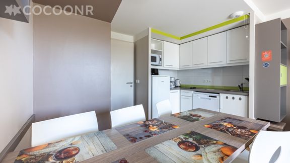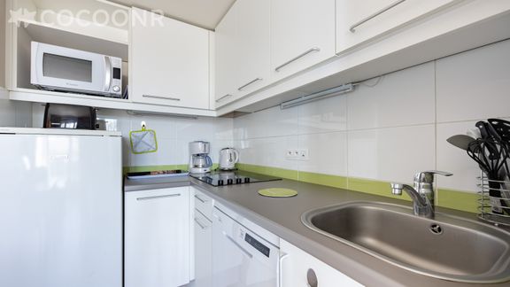 - Une cuisine ouverte équipée avec notamment : bouilloire électrique, four à micro-ondes, grille-pain, cafetière, lave-vaisselle, 4 plaques de cuisson...
