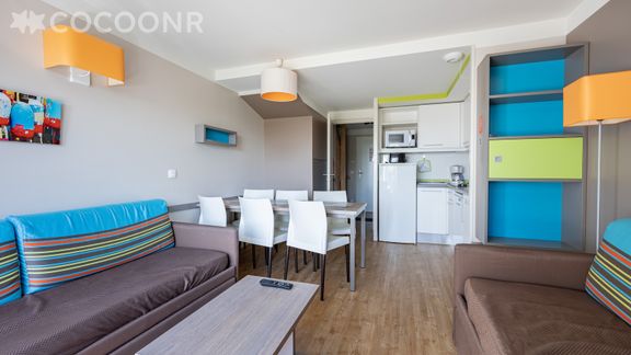 - Une pièce de vie de 19 m² sans vis à vis avec TV, des canapés convertibles (3 couchages) et coin repas pouvant accueillir 7 convives.