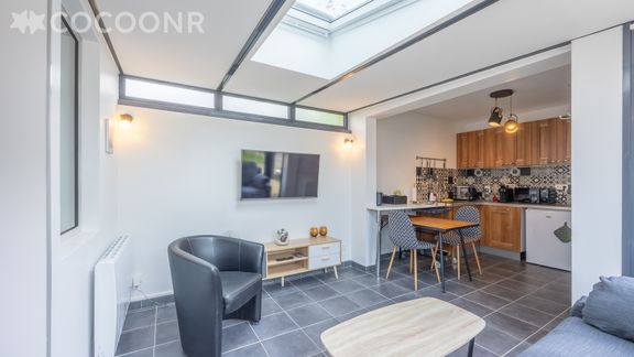 - Une pièce de vie de 15 m² avec TV, fauteuil, canapé et coin repas