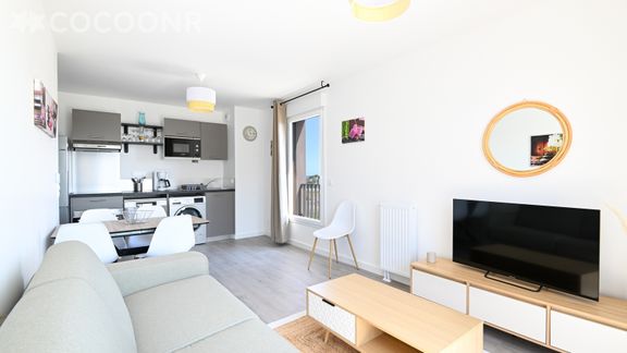 L'agence Cocoonr/Book&Pay vous propose à la location, à Courseulles-sur-Mer, cet appartement d’une superficie de 57 m² et pouvant accueillir jusqu’à 4 voyageurs. Situé au 3e et dernier étage avec ascenseur, il se compose d’une pièce à vivre de 27 m², d'une cuisine équipée, de deux chambres, d'une salle d'eau avec douche.