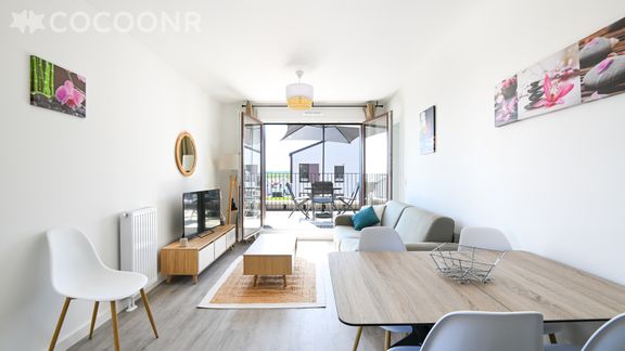 - Une pièce de vie de 27 m² avec TV, un canapé et un coin repas