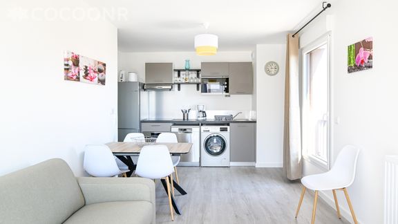 - Une cuisine ouverte et équipée avec notamment : bouilloire électrique, four, four à micro-ondes, grille-pain, lave-vaisselle, plaques de cuisson...