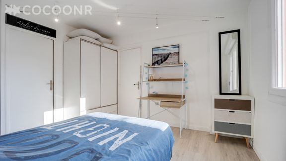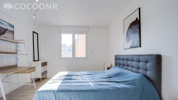 - Chambre aménagée avec un lit double 140 cm x 190 cm, un bureau et une penderie