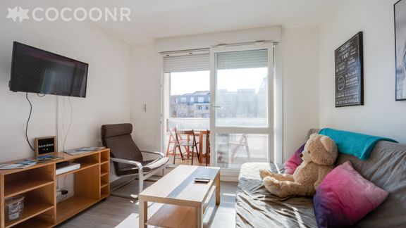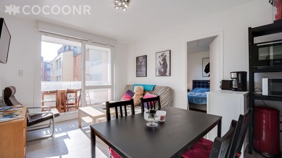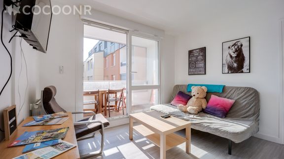 - Pièce de vie lumineuse grâce à sa grande baie vitrée donnant accès au balcon. La pièce de vie comprend un canapé convertible en lit double, table basse, TV. Wifi dans tout l'appartement.
