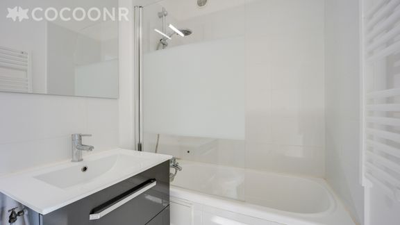 - Salle de bain avec baignoire, lavabo et sèche-serviettes. WC