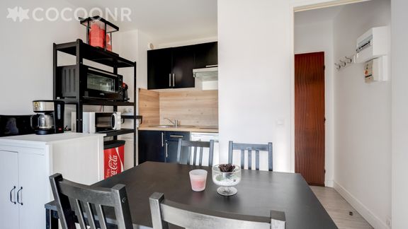- Kitchenette équipée (four, micro ondes, réfrigérateur, grille pain, vaisselle et couverts...) ouverte sur le séjour avec son coin repas aménagé d'une table à manger et de ses 4 chaises.