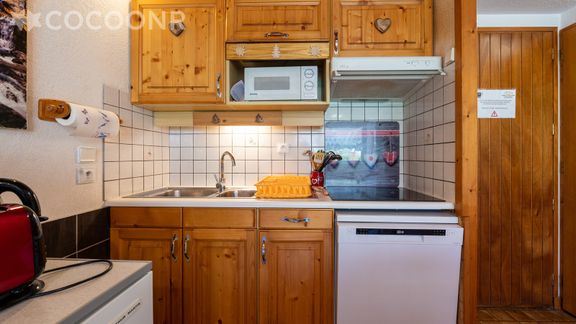 - Une cuisine ouverte équipée avec notamment : bouilloire électrique, four, four à micro-ondes, grille-pain, lave-vaisselle, plaques de cuisson...