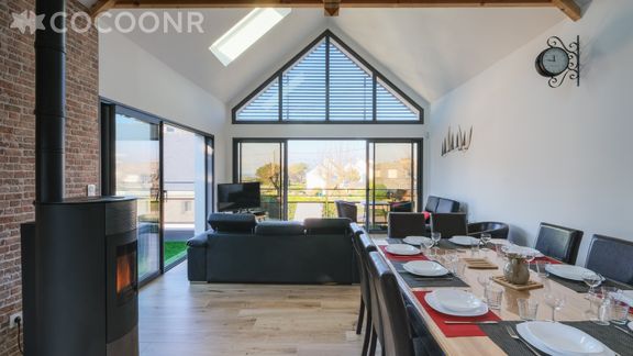 - Une pièce de vie de 35 m² avec TV, canapés, poêle et un espace repas