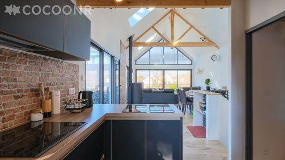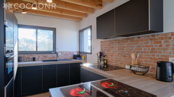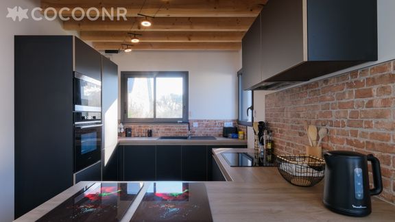- Une cuisine ouverte, équipée avec notamment : bouilloire électrique, four, four à micro-ondes, grille-pain, lave-vaisselle, plaques de cuisson...
