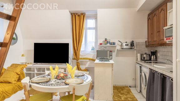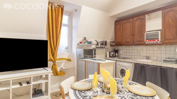 - Kitchenette équipée ouverte sur le séjour : four, plaques de cuisson, réfrigérateur, micro-ondes, cafetière, bouilloire, grille-pain, vaisselle et couverts, machine à laver...