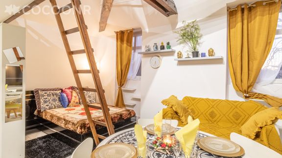 - Un second lit double (140 cm x 190 cm), en mezzanine accessible par une échelle.