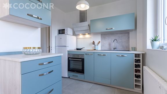 - Une cuisine entièrement équipée ouverte sur le salon/salle à manger : lave-vaisselle, four, plaques de cuisson, réfrigérateur, micro-ondes, bouilloire, cafetière, vaisselle et couverts...