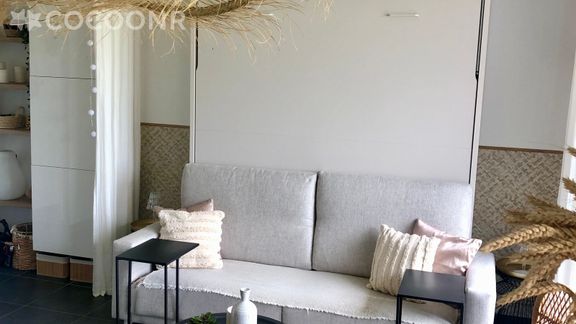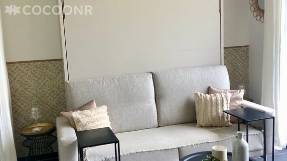 - Une pièce de vie de 23 m² avec TV, un coin repas, et un lit queen-size (160×200) escamotable, rabattable sur un canapé 3 places.