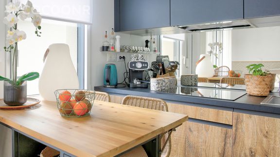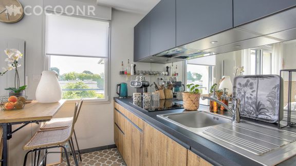 - Une cuisine équipée avec notamment : bouilloire électrique, four, four à micro-ondes, grille-pain, lave-vaisselle, plaques de cuisson...