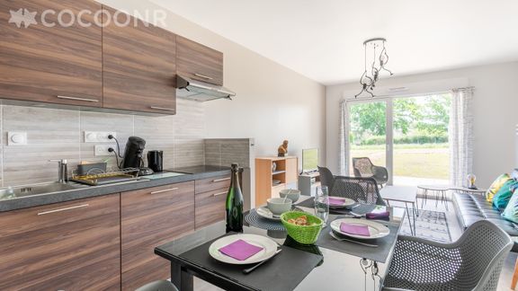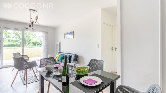 - Une pièce de vie lumineuse avec un coin salon doté d'un canapé-lit (120x190), une table basse et une TV ainsi qu'un espace repas avec une table de réception.