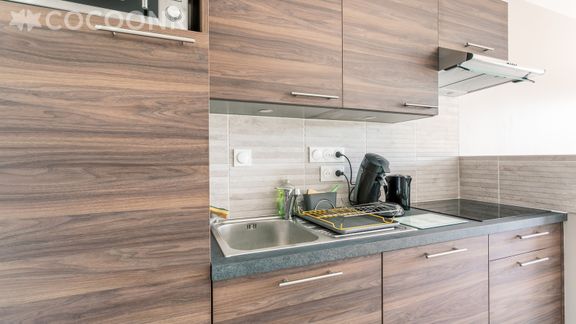 - Une kitchenette moderne, ouverte sur le salon et entièrement équipée : réfrigérateur, four, plaques à induction, micro-ondes, grille-pain, bouilloire, cafetière ...