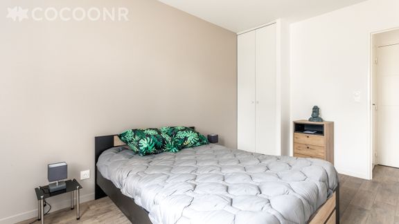 - Une chambre avec un lit double et un grand placard.