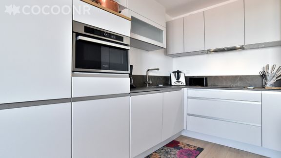 - Une cuisine ouverte équipée avec notamment : bouilloire électrique, four, four à micro-ondes, grille-pain, lave-vaisselle, plaques de cuisson...