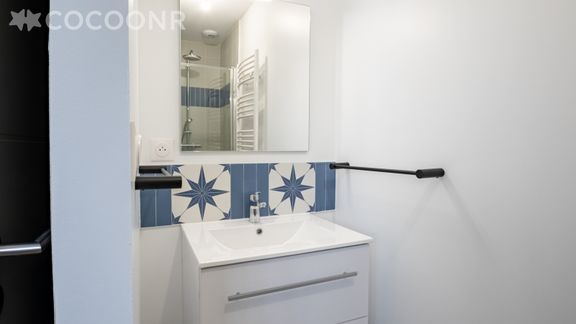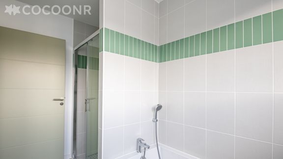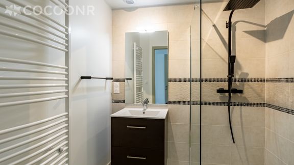 - Suite parentale 1 : un lit double 160 x 200 cm, rangements. Salle d'eau avec douche, lavabo, sèche-serviettes. Accès direct à la terrasse et au jardin par une grande baie vitrée.