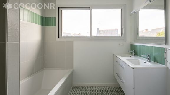 - Salle de bain avec baignoire et douche, double vasque, sèche-serviettes