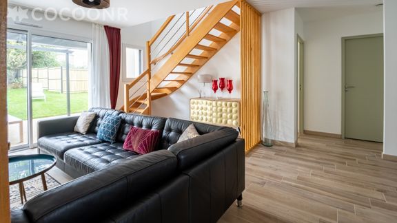 La maison de 117 m² pouvant accueillir jusqu'à 8 voyageurs se compose d'une pièce de vie avec cuisine semi-ouverte toute équipée, 4 chambres, 2 salles d'eau et une salle de bain. Jardin et terrasse pour vos repas en extérieur. Deux places de parking.