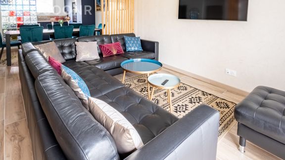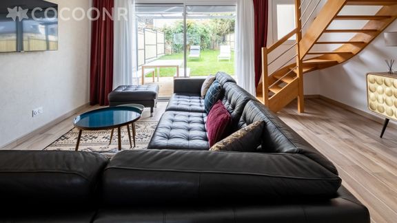 - Grande pièce à vivre aux lignes modernes aménagée avec canapé, tables basses, TV. Accès direct à la terrasse et au jardin
