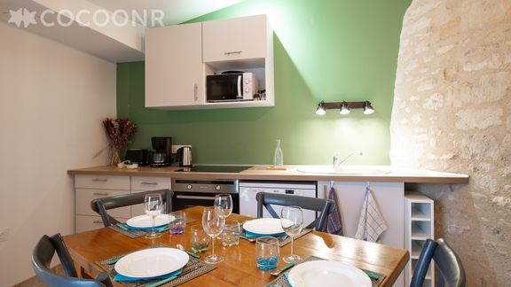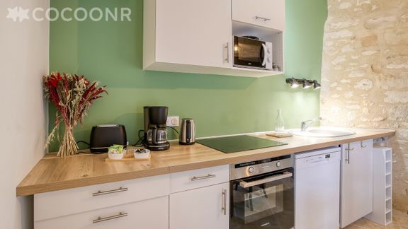 - Une cuisine équipée avec notamment : bouilloire électrique, four, four à micro-ondes, grille-pain, lave-vaisselle, plaques de cuisson...
