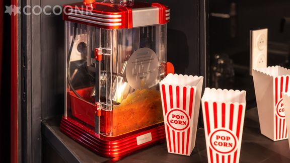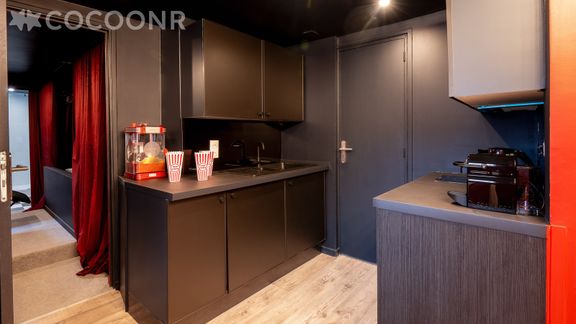 - Une pièce de vie de 10 m² avec espace repas, fauteuils et kitchenette équipée avec notamment : bouilloire électrique, four à micro-ondes, grille-pain, plaques de cuisson...