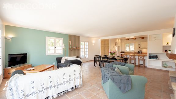 - Une pièce de vie de 47 m² avec canapés, TV, coin repas