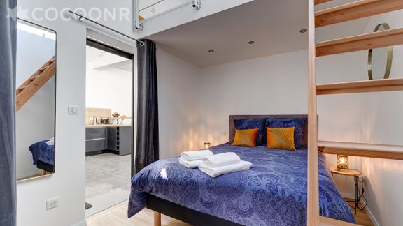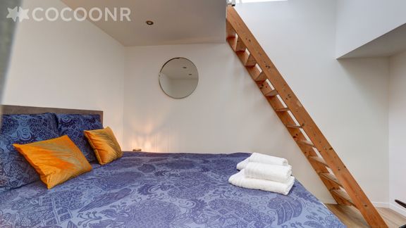 - Chambre 1 : avec un lit double (140×200) et une mezzanine dans laquelle se trouve une chauffeuse se transformant en un couchage de 120x190