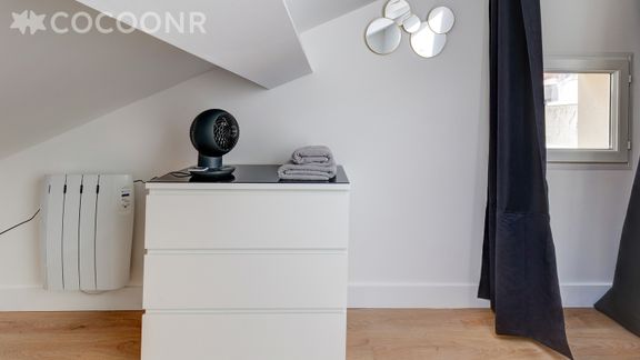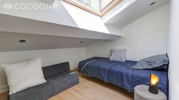 - Une petite chambre avec un lit 90x190 et une chauffeuse se transformant en un couchage 120x190.