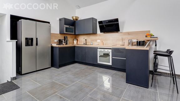 - Une cuisine ouverte équipée avec notamment : bouilloire électrique, four, four à micro-ondes, grille-pain, lave-vaisselle, plaques de cuisson...