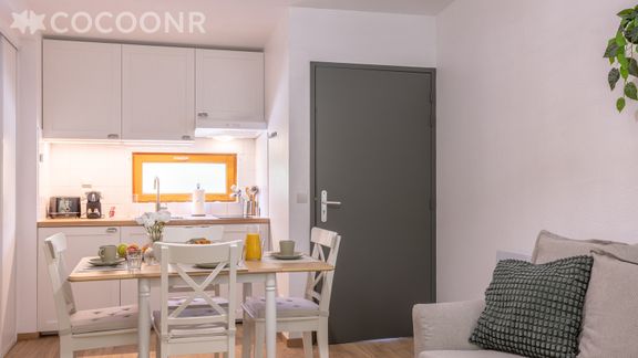 - Une cuisine équipée avec notamment : bouilloire électrique, four à micro-ondes, grille-pain, lave-vaisselle, plaques de cuisson...