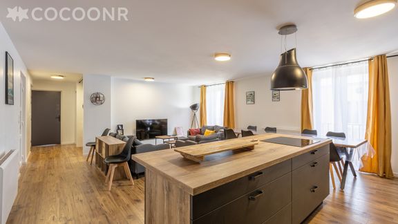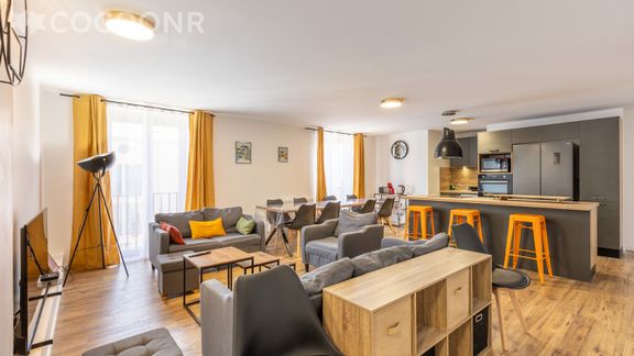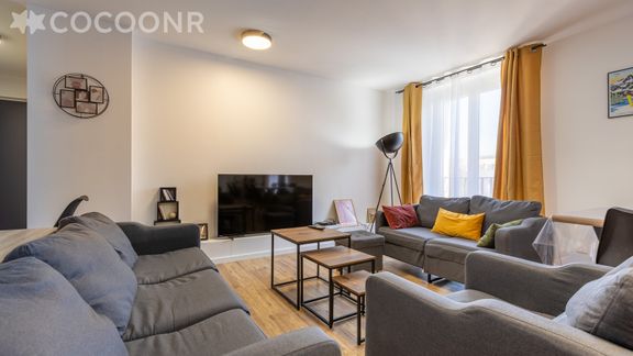 - Une pièce de vie de 42 m² avec canapés, espace repas et TV