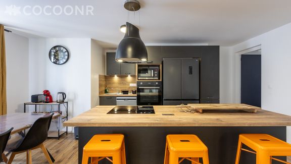 - Une cuisine ouverte, équipée avec notamment : bouilloire électrique, four, four à micro-ondes, grille-pain, lave-vaisselle, plaques de cuisson...