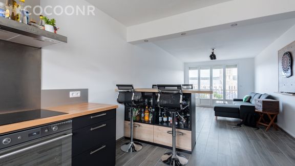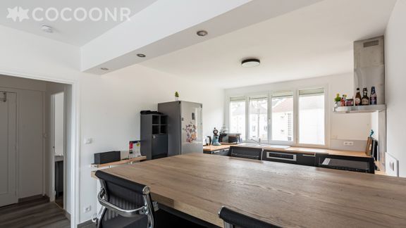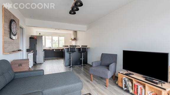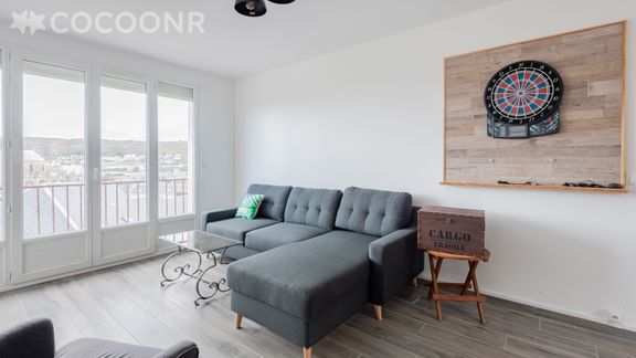 - Une pièce de vie lumineuse de 30 m² avec TV, canapé convertible (double), espace repas pour 4 convives et accès au balcon.