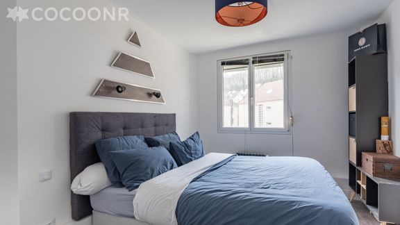- Une chambre avec un lit queen-size (160×200) et des rangements.