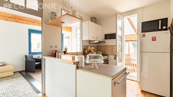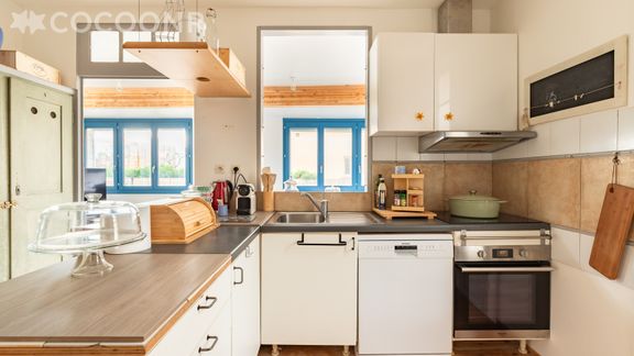 - Une cuisine ouverte équipée avec notamment : bouilloire électrique, four, four à micro-ondes, grille-pain, lave-vaisselle, plaques de cuisson, machine à café Nespresso...