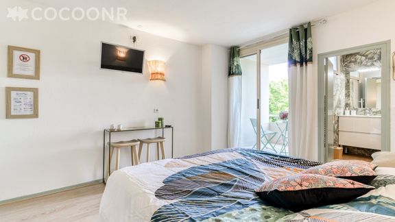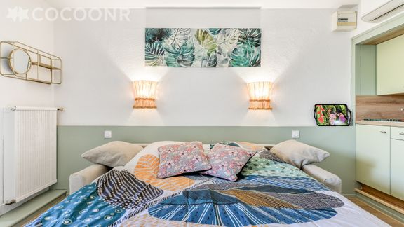 - Une pièce de vie de 18 m² avec TV, canapé lit double (160x200)...