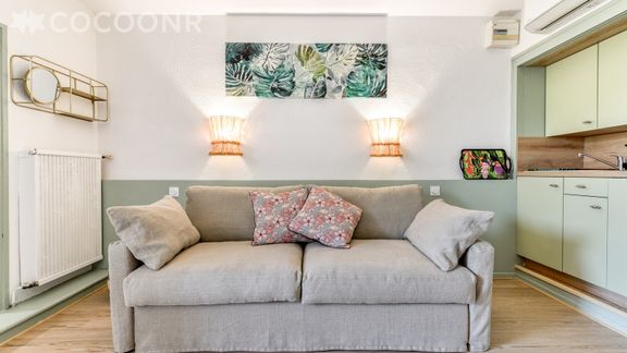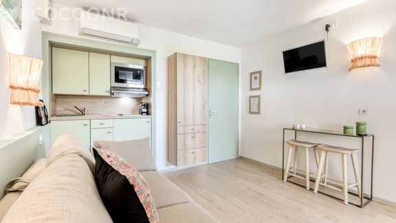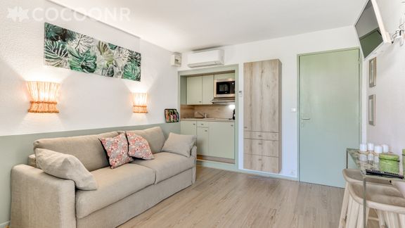 L'Agence Cocoonr/Book&Pay vous propose, à Saint Pierre la Mer, ce beau studio climatisé au pied de la plage, de moins de 100 m de la plage, d’une superficie de 18 m² et pouvant accueillir jusqu’à 2 voyageurs. Situé au 1er étage (sans ascenseur), il se compose d’une jolie pièce à vivre de 18 m², d'une cuisine équipée, et d'un espace nuit, une salle de bain.