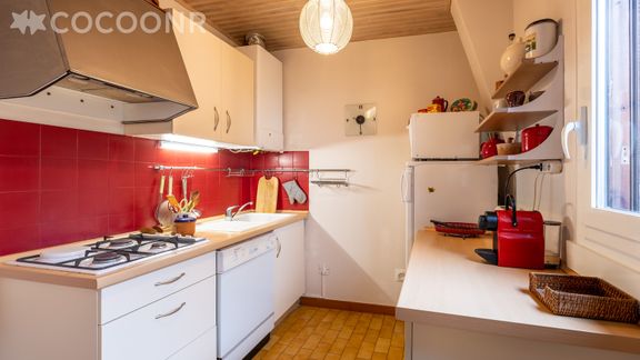 - Une cuisine équipée avec notamment : bouilloire électrique, four micro-ondes combiné, grille-pain, lave-vaisselle, plaques de cuisson, cafetière à dosettes Nespresso...
