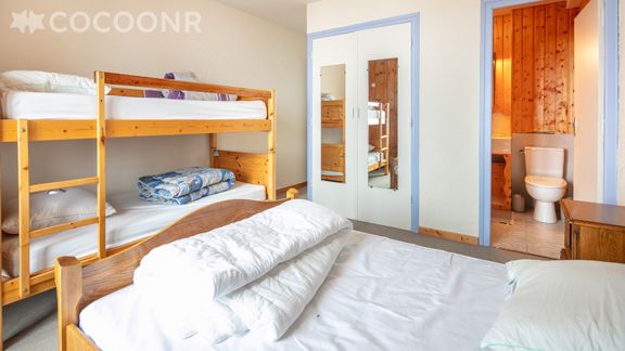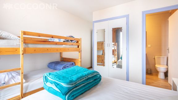 - Chambre 1 : un lit double (140×190) et un lit superposé avec salle d'eau attenante (avec douche et WC)