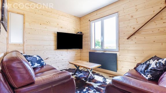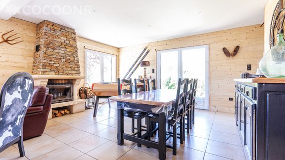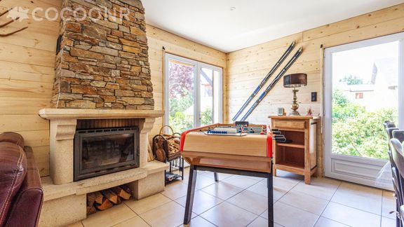 - Une pièce de vie de 39 m² avec TV, cheminée, canapés, espace repas et baby-foot et jeux de société.