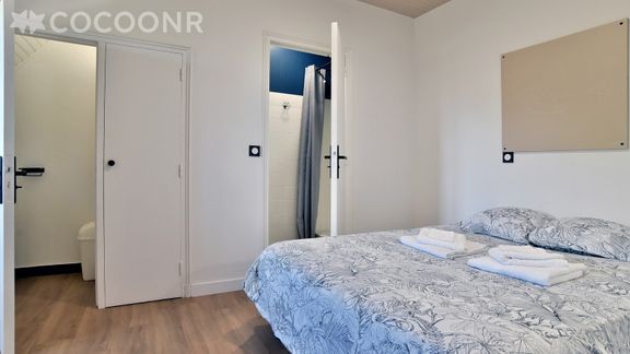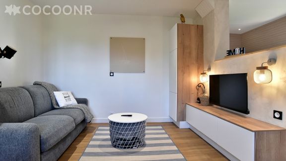 - Une pièce de vie avec TV, canapé lit-double et espace repas.