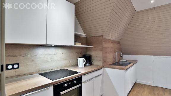 - Une cuisine ouverte équipée avec notamment : bouilloire électrique, four, grille-pain, lave-vaisselle, plaques de cuisson...