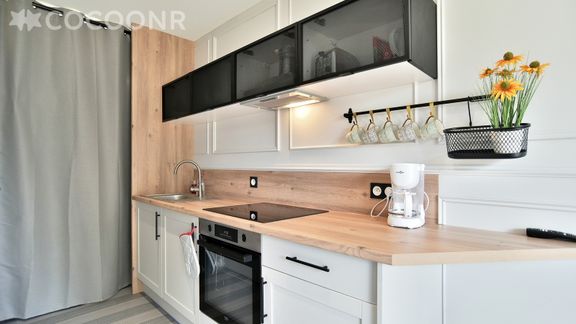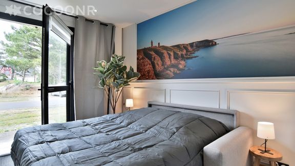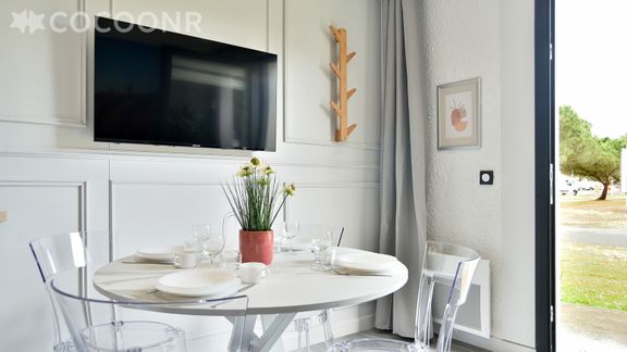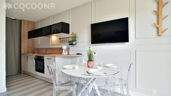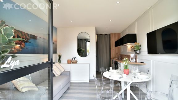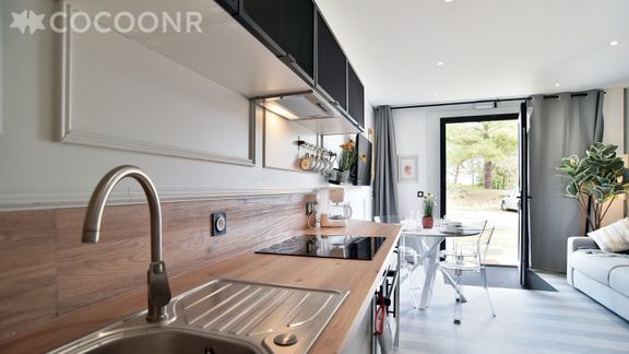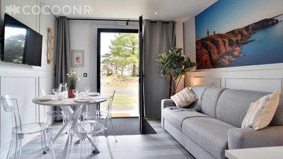 - Une pièce de vie de 18 m² avec TV, canapé-lit double, cuisine équipée avec notamment : bouilloire électrique, four, grille-pain, plaques de cuisson...